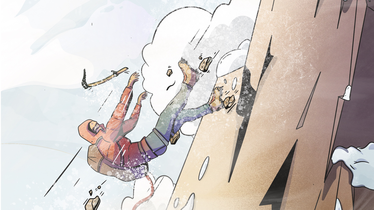 筆者ジャスティンとパートナーのライアンは、アラスカ山脈の「ムースの歯(Moose's Tooth)」の南東壁にある「ハム&エッグス(Ham and Eggs)」ルートのソロ登攀に挑んでいた。標高4,000フィート(約1,200m)を登り、残りは1,000フィート(約300m)という状況で、ライアンはリードを続け、ジャスティンはアンカーを解除して追従していた。彼らは軽量化のため、寝袋やテントを持たず、タープと10個のプロテクション、薄手のジャケットのみを携行していた。このルートは、急峻な花崗岩と氷の混合登攀で知られ、彼らは迅速なペースで高度を上げていた。